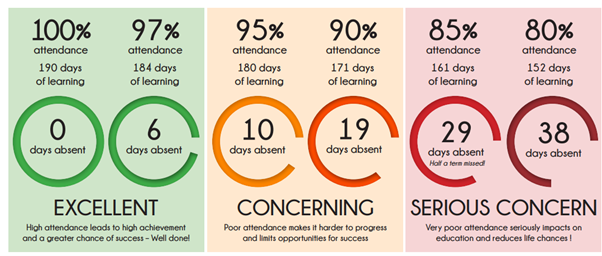 Research shows a direct link between high attendance and doing well at school. All children have the right to an education. We encourage and expect 100% attendance for all pupils.
